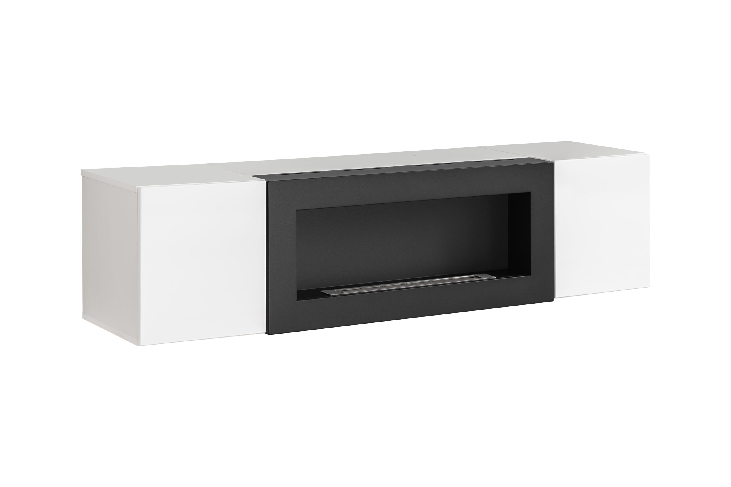 Kommode mit Kamin: Links und rechts je eine Hochglanztűr, innen je ein offenes Fach. In der Mitte ein Biokamin.